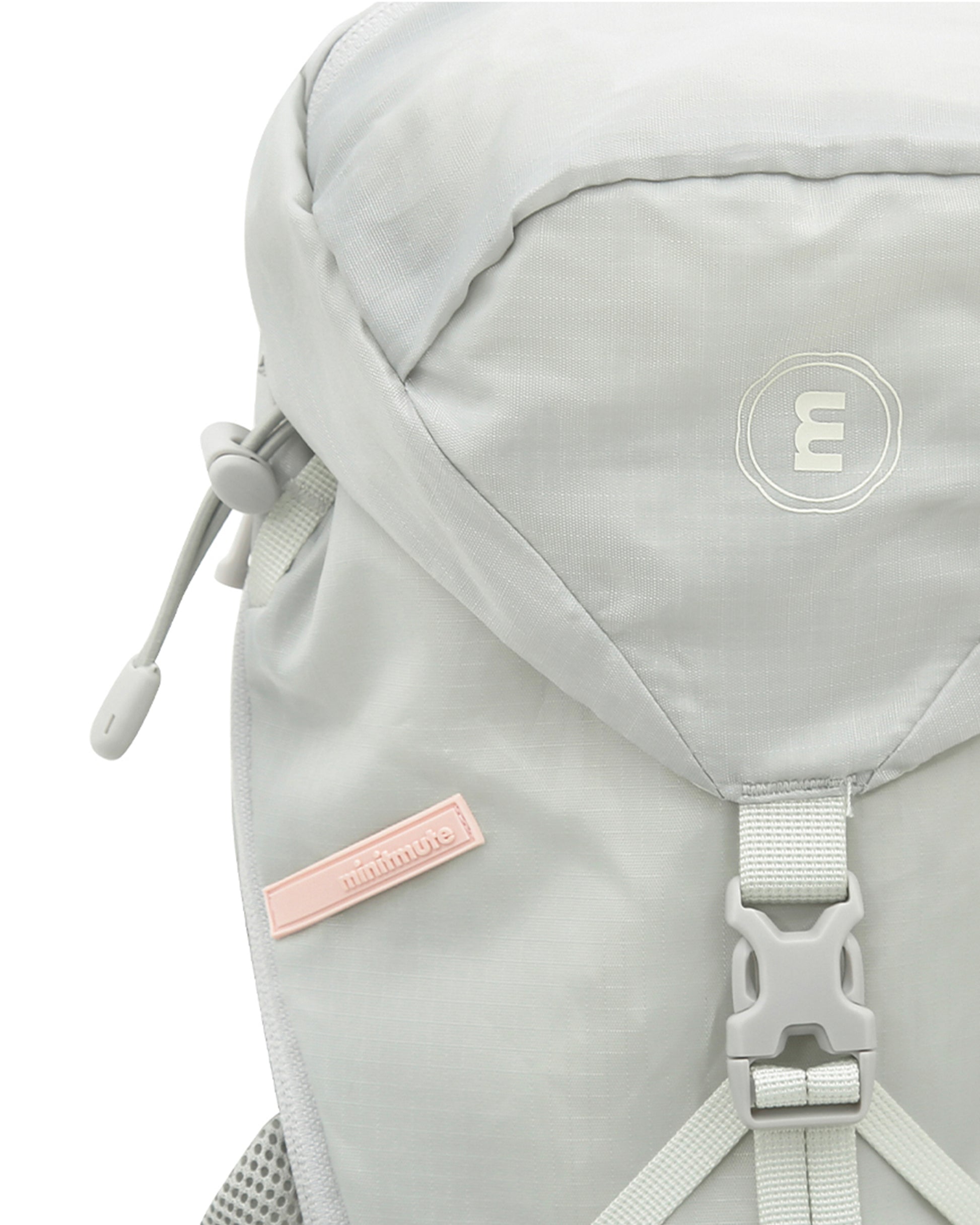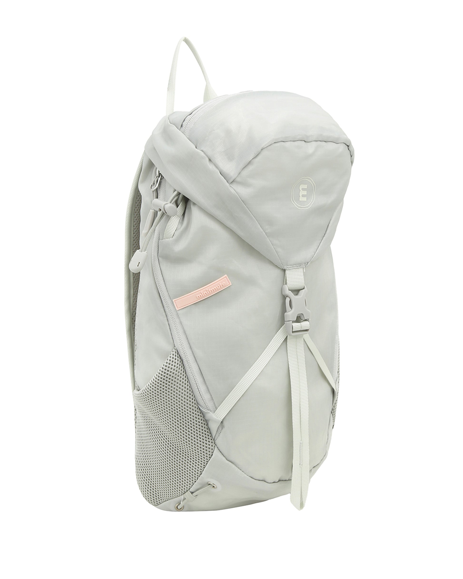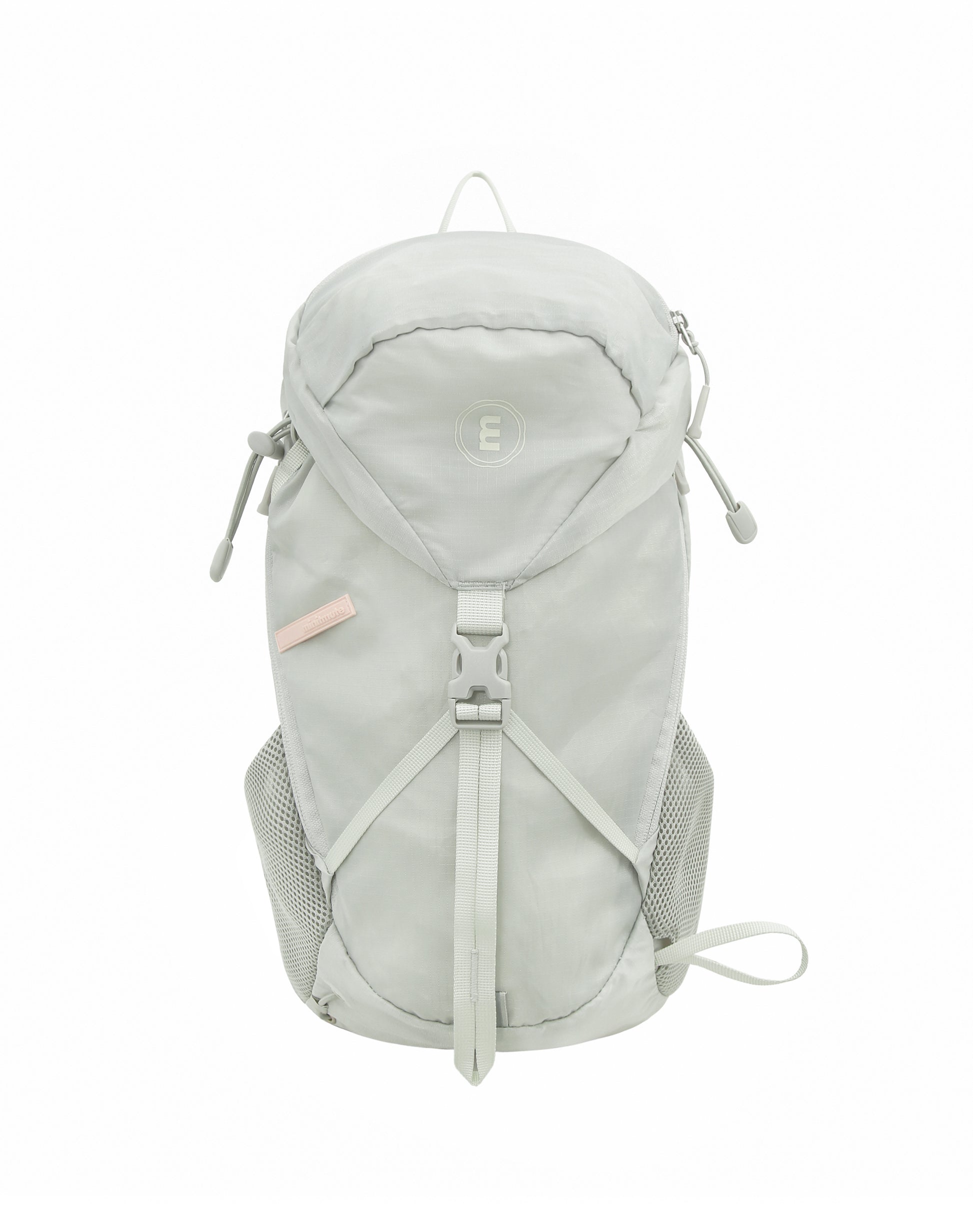 ミニットミュートのsporty bask backpackです。「日差しを浴びる」という意味が込められている「bask」ラインは、日常の散歩から旅行まで、様々なアウトドアのシーンを楽しむために存在します。リップストップ構造の組織感が特徴の薄くて軽い生地を使用。優れた耐久性と生活防水機能が特徴で、アウトドアの製品に主に使用されている生地です。様々な収納スペースとキーリングフックがあり、実用性が高いです。横にファスナーがあり、バッグを肩にかけたまま、荷物を取り出すことができます。ミニットミュートのロゴ刻印、スポーティラインのシグネチャーピンクタグからブランドのアイデンティティを感じられます。