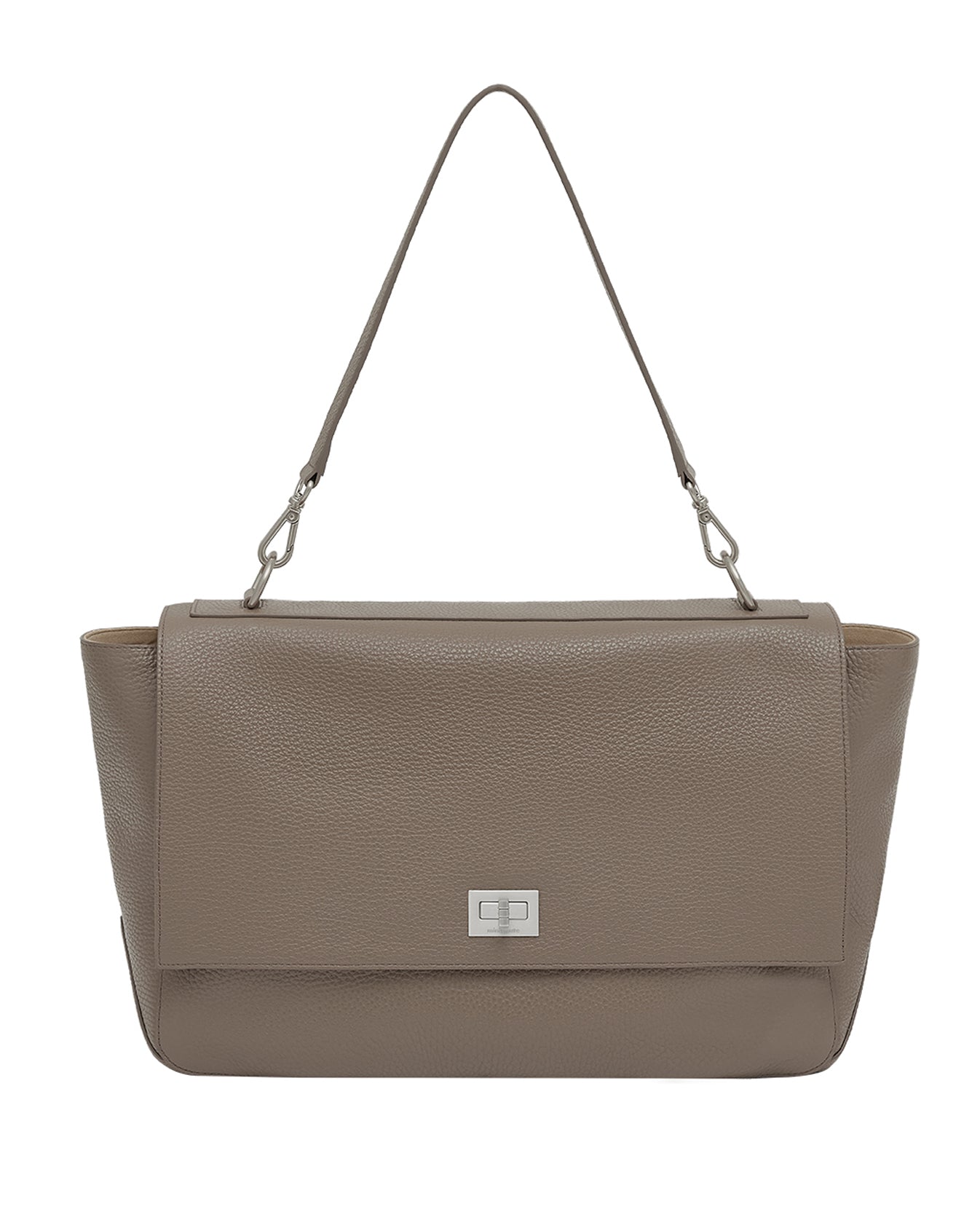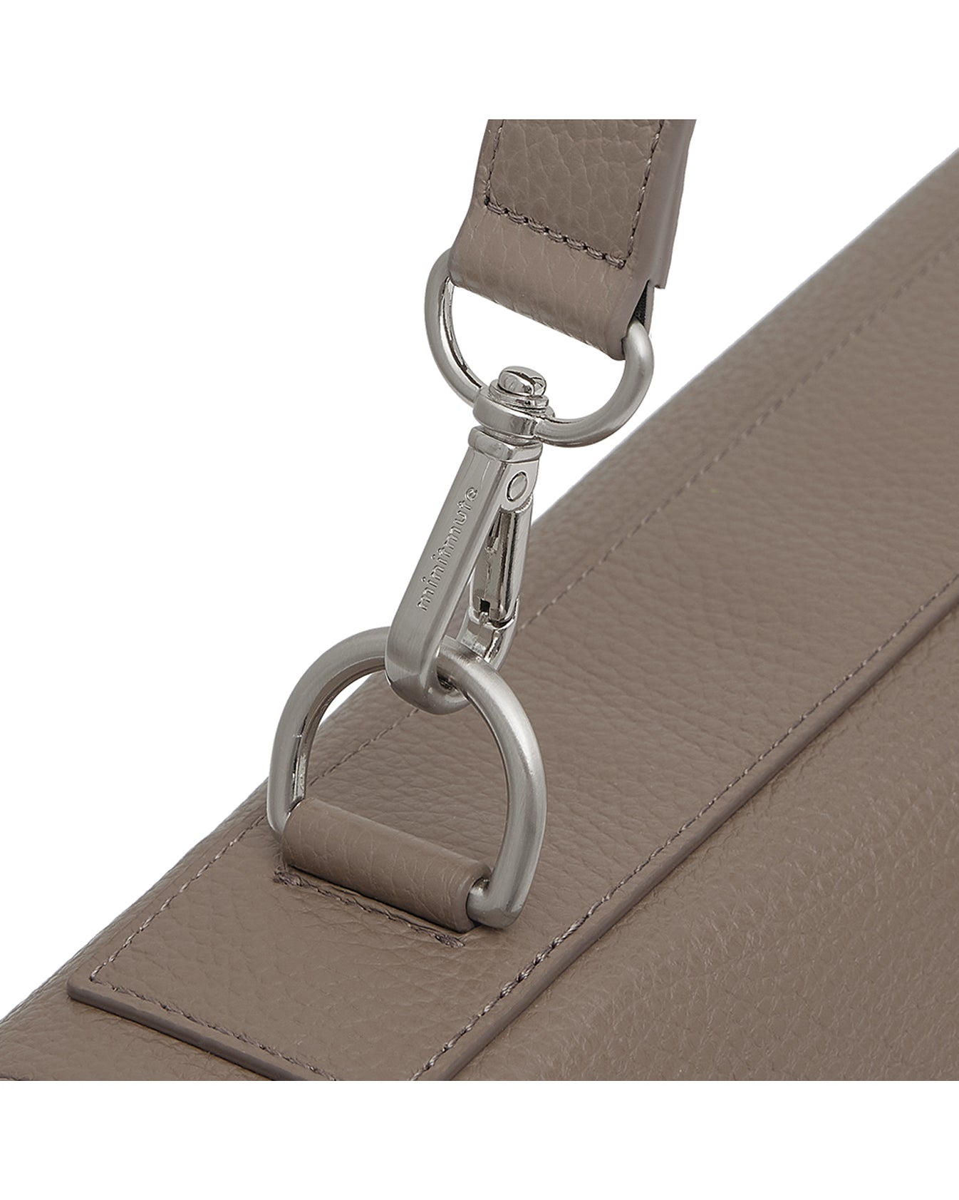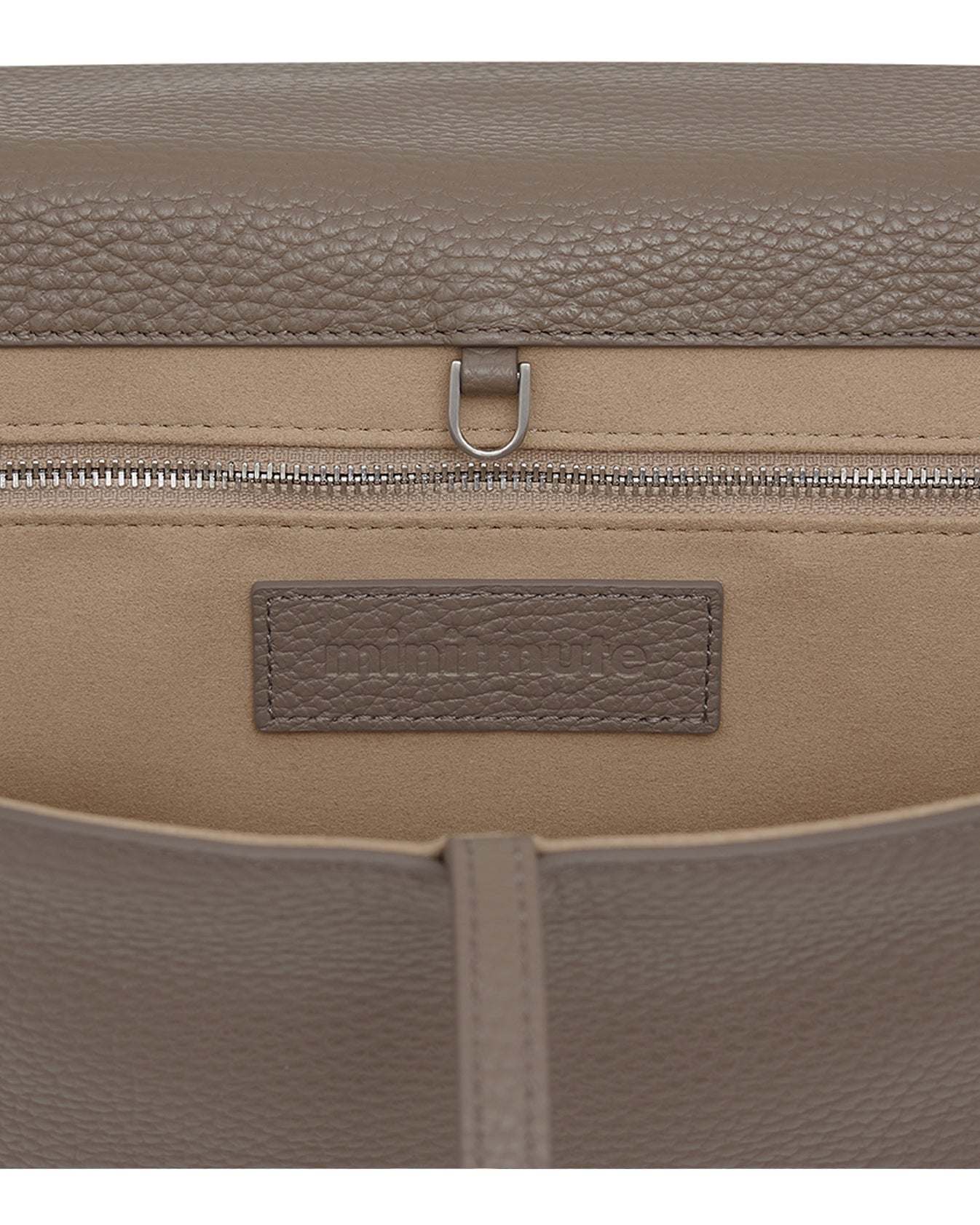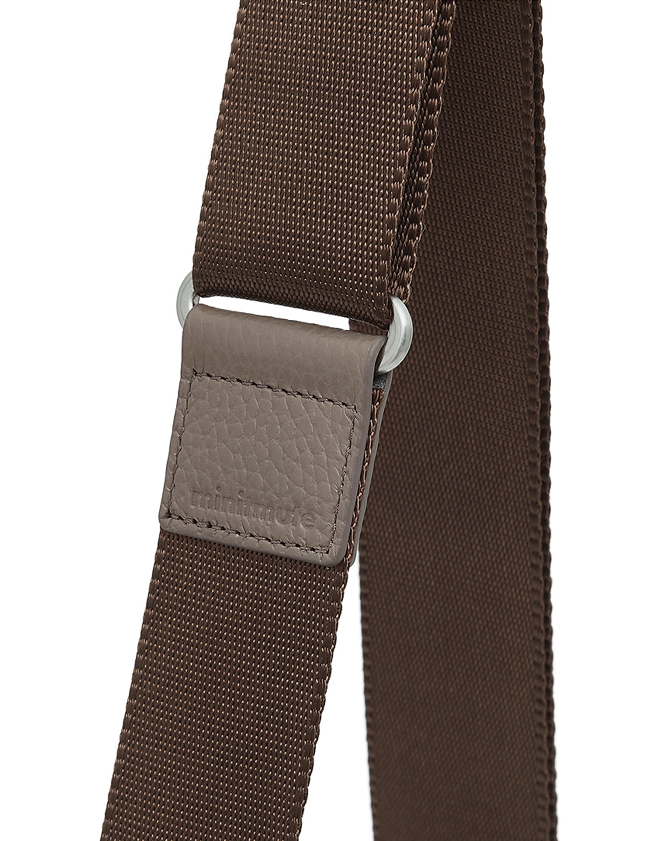 ミニットミュートのferretti Lです。イタリアのエンボシュランケンタイプで、不規則で自然なエンボが特徴です。革の表面がコーティング処理されており、 キズや水分に強いため楽々にご使用いただけます。革素材ショルダーストラップとワイドウェビングクロスストラップの2種類のストラップを活用して様々なムードで着用できます。また、内部のフック型のロックでカバンを開けた状態でも荷物を保護できるよう安全性を高めました。シャムード裏地とニッケルサテン、ミニットミュートチェーンシンボルを加え、魅力を最大化しました。