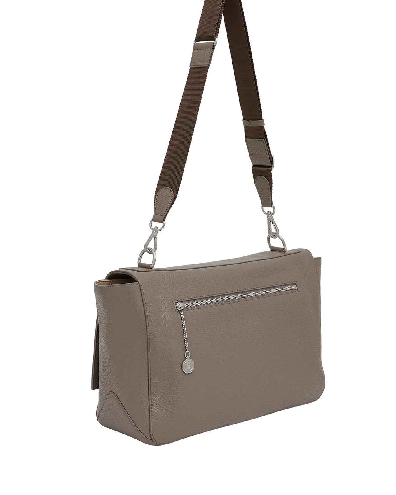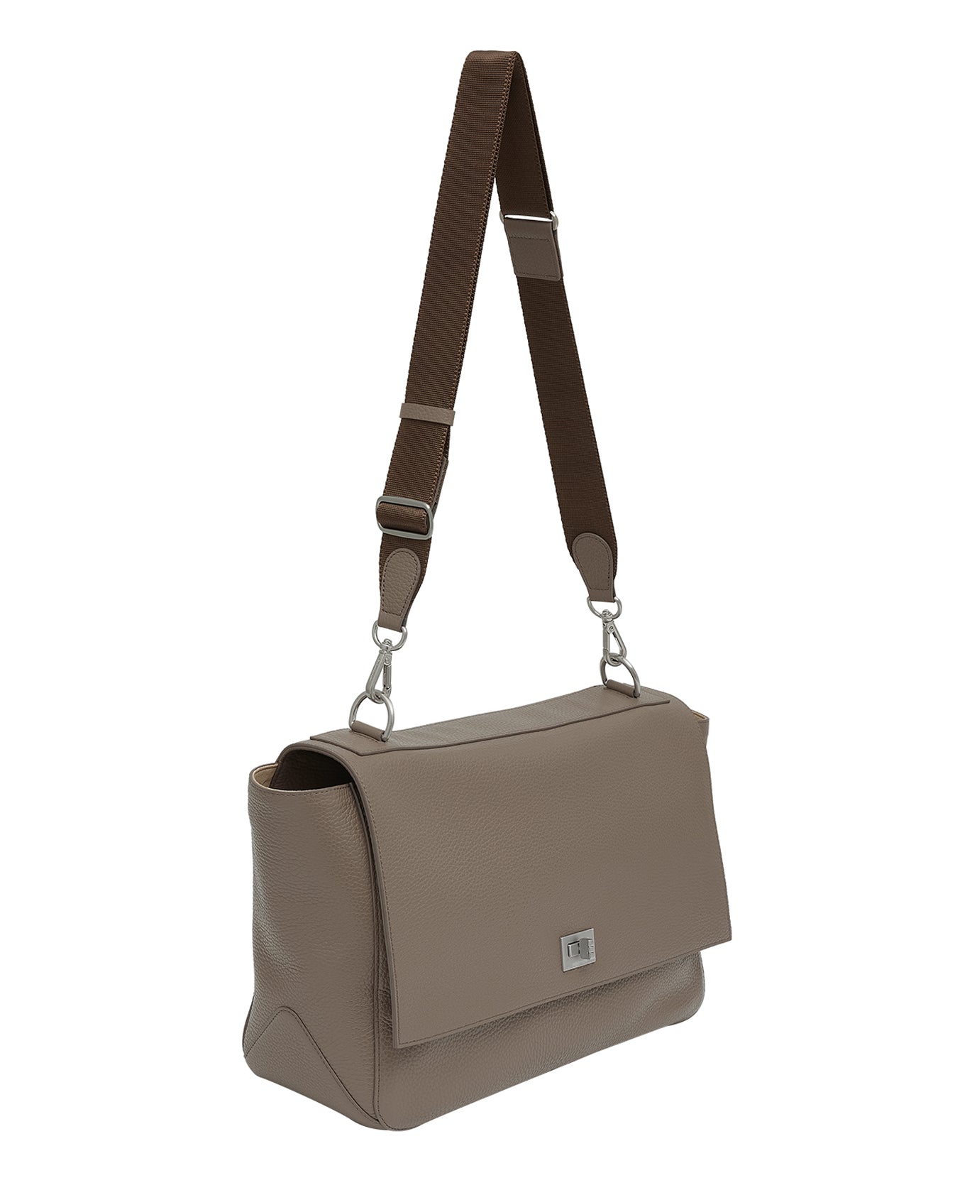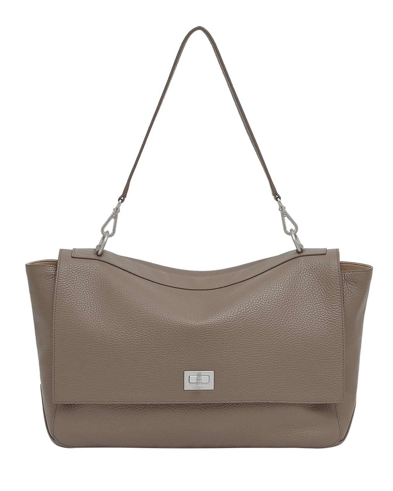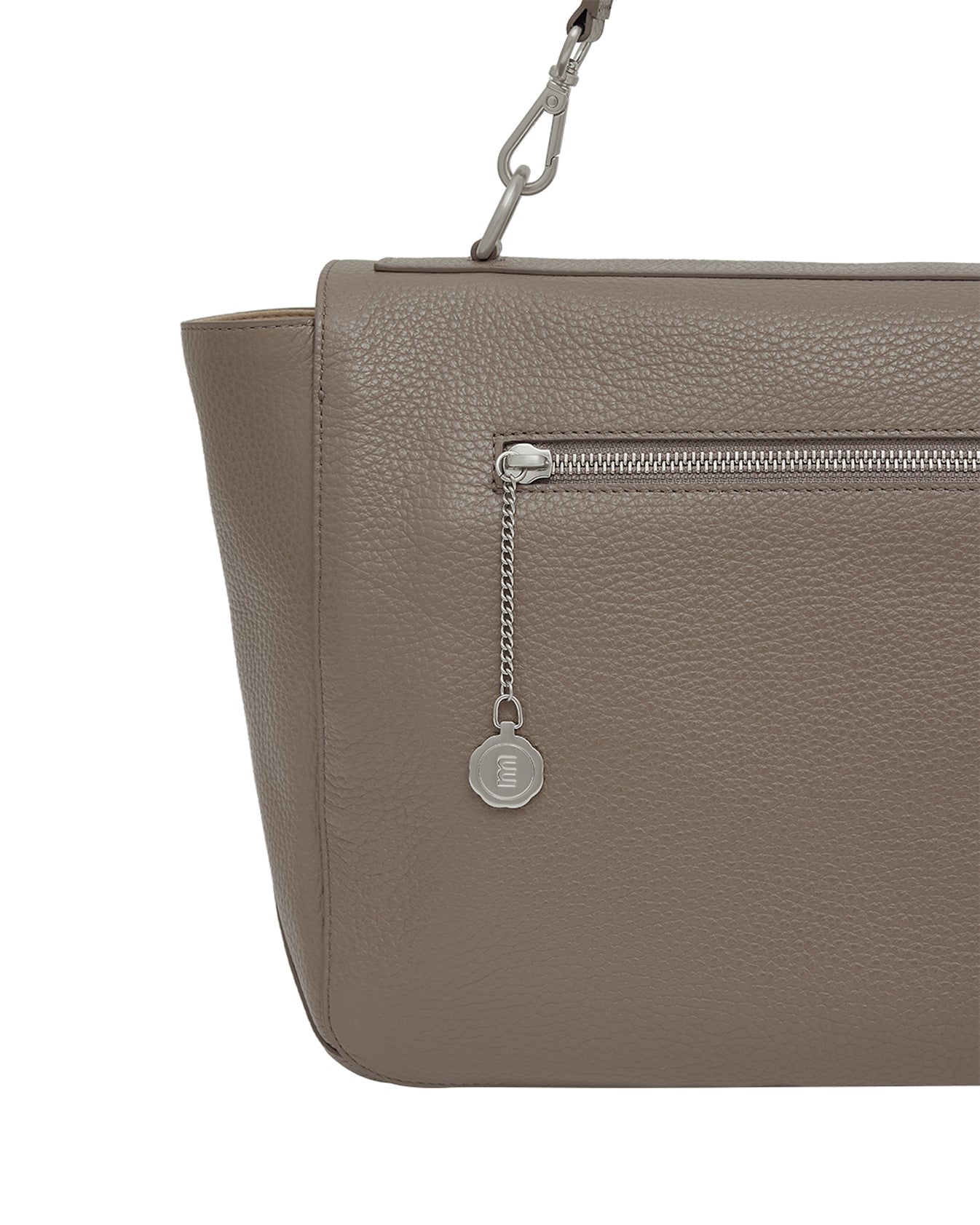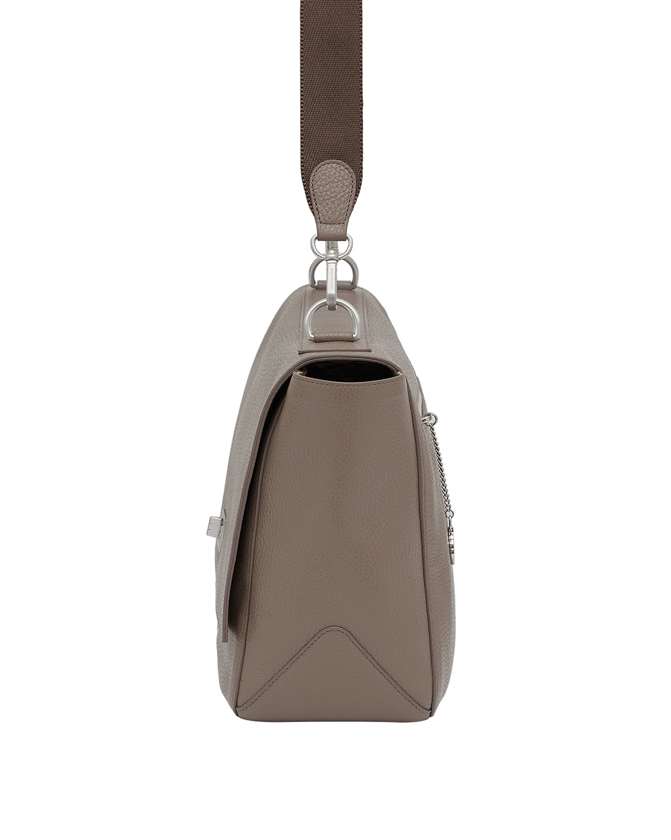 ミニットミュートのferretti Lです。イタリアのエンボシュランケンタイプで、不規則で自然なエンボが特徴です。革の表面がコーティング処理されており、 キズや水分に強いため楽々にご使用いただけます。革素材ショルダーストラップとワイドウェビングクロスストラップの2種類のストラップを活用して様々なムードで着用できます。また、内部のフック型のロックでカバンを開けた状態でも荷物を保護できるよう安全性を高めました。シャムード裏地とニッケルサテン、ミニットミュートチェーンシンボルを加え、魅力を最大化しました。