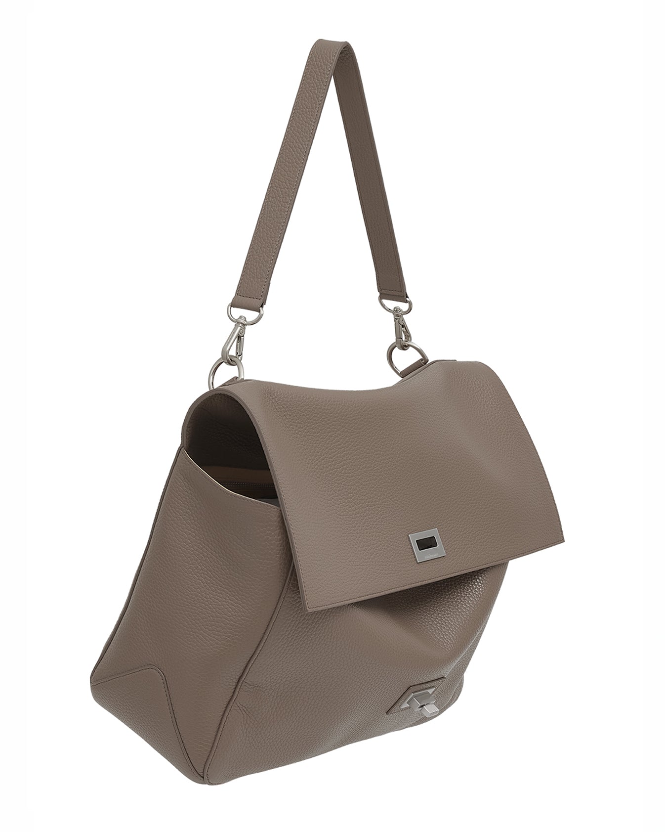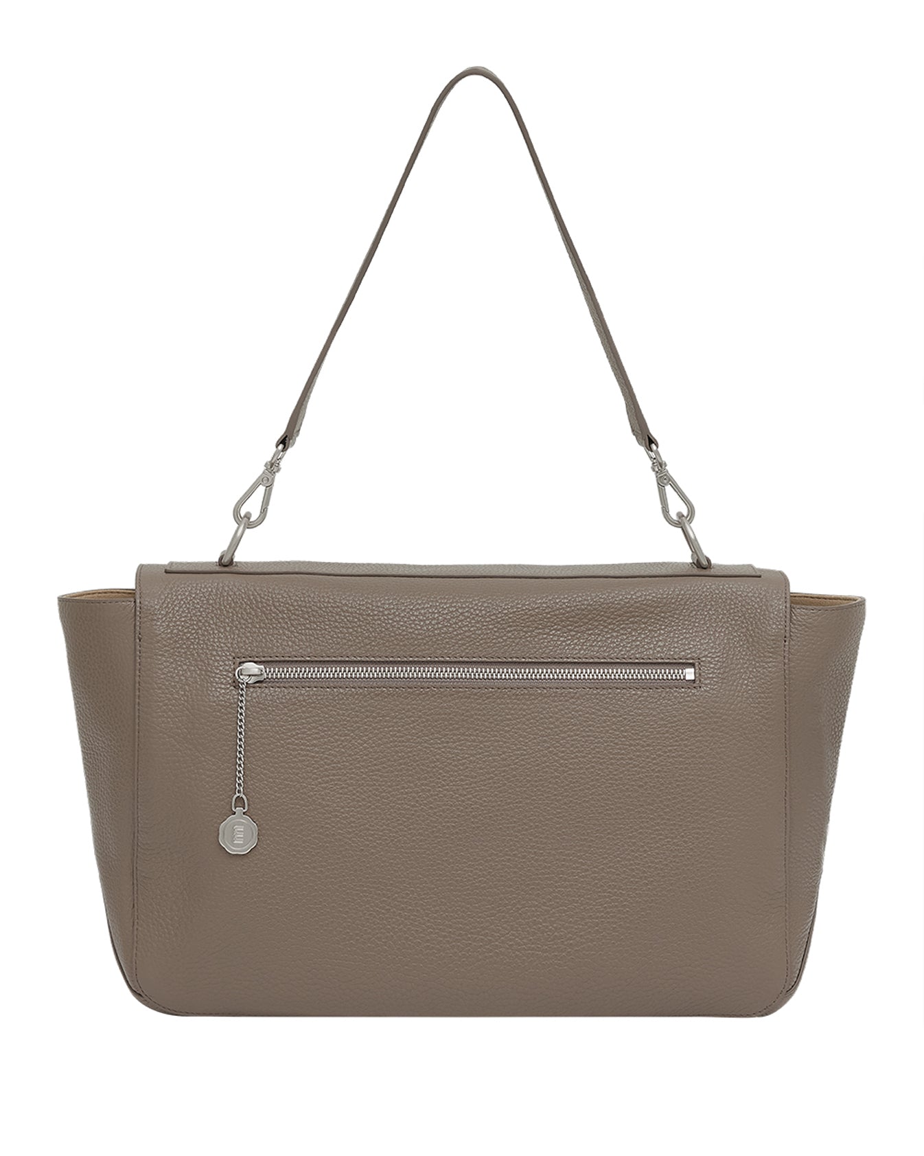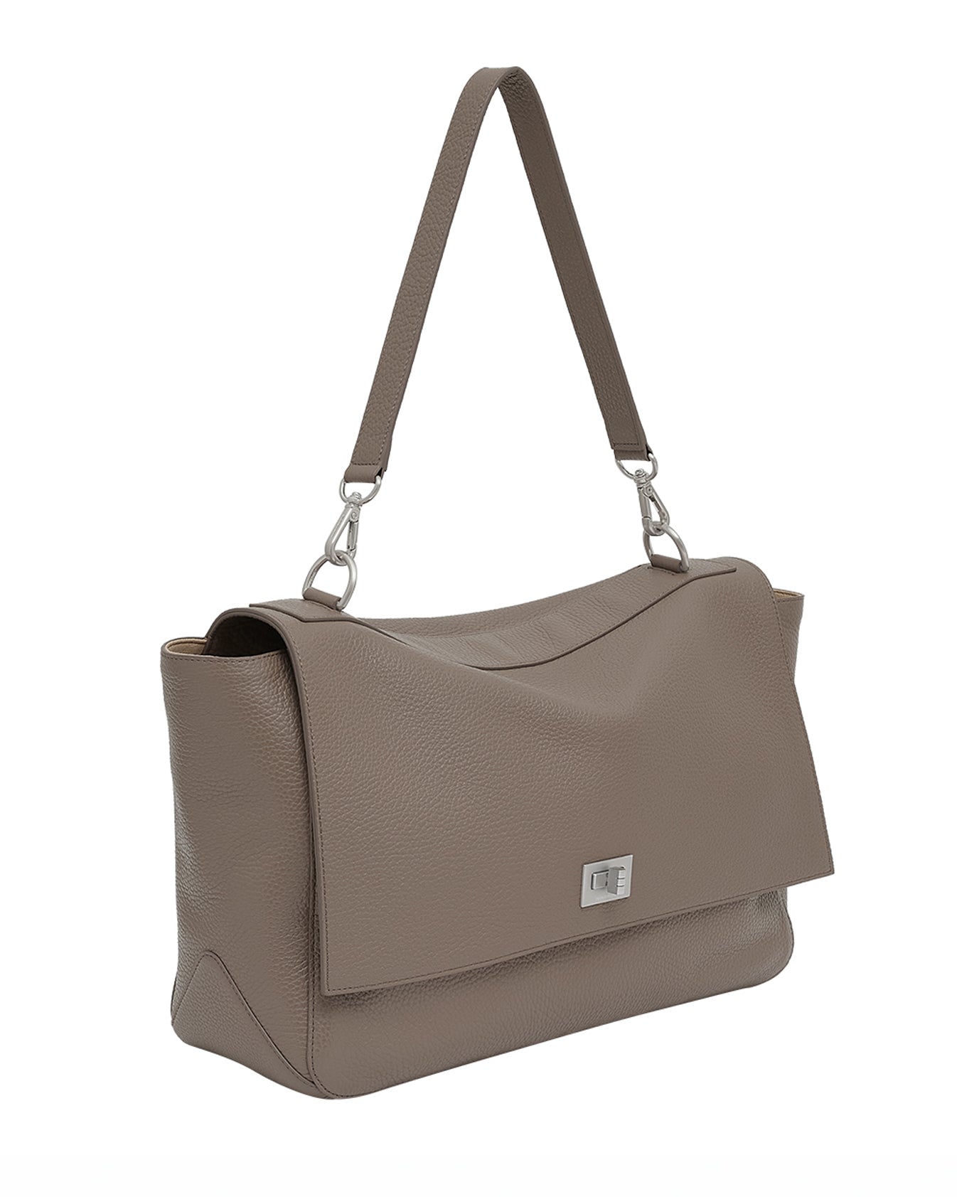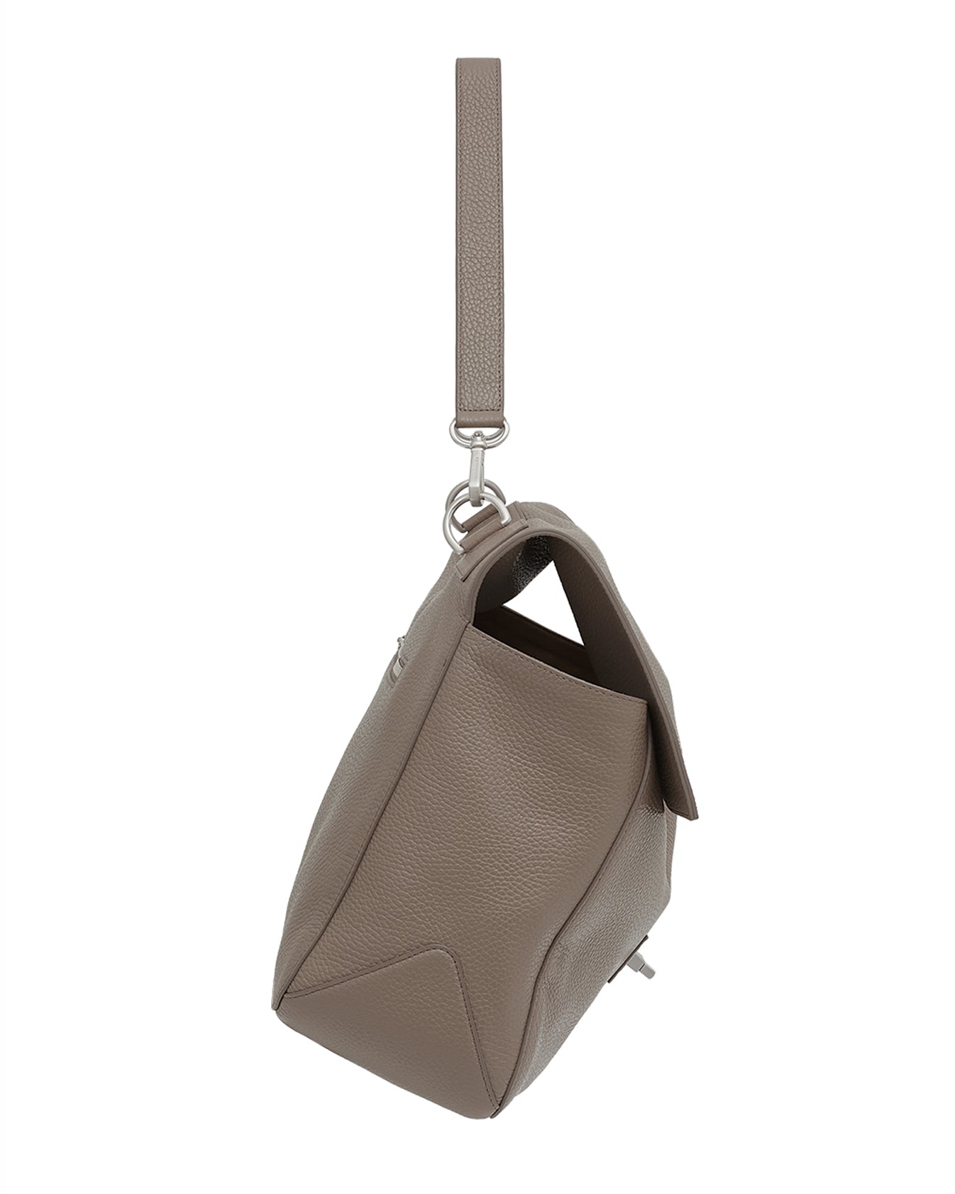 ミニットミュートのferretti Lです。イタリアのエンボシュランケンタイプで、不規則で自然なエンボが特徴です。革の表面がコーティング処理されており、 キズや水分に強いため楽々にご使用いただけます。革素材ショルダーストラップとワイドウェビングクロスストラップの2種類のストラップを活用して様々なムードで着用できます。また、内部のフック型のロックでカバンを開けた状態でも荷物を保護できるよう安全性を高めました。シャムード裏地とニッケルサテン、ミニットミュートチェーンシンボルを加え、魅力を最大化しました。